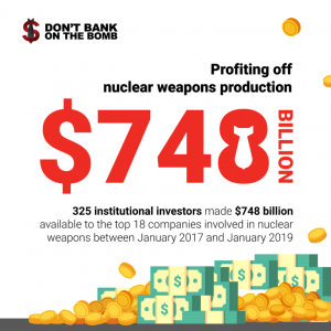 Don’t Bank on the Bomb is a project by Dutch peace organisation PAX in support of ICAN efforts to stigmatize, outlaw and eliminate nuclear weapons. Don’t Bank on the Bomb identifies the companies that produce (key components of) nuclear weapons and the financial institutions that invest significantly in these companies. One of the unique features of Don’t Bank on the Bomb are the positive examples of financial institution polices that limit or prohibit financing of companies associated with the production of nuclear weapons. Don’t Bank on the Bomb both illuminates how profitable it can be for multinational corporations to manufacture nuclear nightmares and provides a roadmap for taking the money out of mass death.