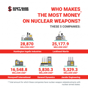 Don’t Bank on the Bomb conducts regular research on the companies involved in the production of nuclear weapons and their investors and publishes this information. It is the only project to do this research and make it freely available. This project provides the research and information necessary to effectively expose and challenge the private sector attempts to profit from the production of nuclear weapons. The Don’t Bank on the Bomb reports are unique in the way they engages new audiences in the efforts to stigmatize nuclear weapons setting the stage for their total elimination.